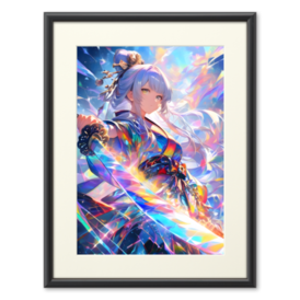 複製画(プリモアート) - A3このアートワークは、プリズムの光でできた流れるような着物をまとった幻想的なアニメ風の女性戦士を特徴としています。彼女の銀青色の髪と落ち着いた集中した表情は、彼女の周囲で渦巻く鮮やかな色彩のスペクトルと見事に対比しています。結晶のような光の破片とエネルギーのリボンが動きと力、そして優雅さを感じさせます。 製品詳細: ファイル形式:PNG 解像度:3072 x 5376 ピクセル スタイル:エーテル、マジカルファンタジー、融合