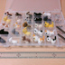 小さな羊毛フェルトのアクセサリートップ25個+ネックレスチェーン1本・イヤリング本体2個・ブローチ台座2個・ヘアクリップ2個のセットです。トップを自由に付け替えることができます。 アクセサリートップは磁石入りのものが15個と金具付きのものが10個です。素材は芯がウールで表面はアクリル繊維になっています。ひとつの大きさは小さいもので概ね3×2×2cmです。 ヘアクリップは磁石入りのものをくっつけることができます。イヤリングは金具付きのものが装着可能です。ネックレスとブローチはどちらにも対応しており、両方を一緒につけることもできます。ネックレスチェーンは約45cmです。 磁石の向きは揃えてあるので、おんぶさせることは可能ですが、お腹同士でくっつけることはできません。重ねた状態では磁力が落ちるのでアクセサリーとしての使用はオススメしません。 30マスのプラスチックケースに入れて発送します。ケースのサイズはB5より少し小さいくらいです。厚みは2cm程度です。 あまり丈夫な作りではありません。