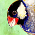 背景を何度か塗り直したので絵の具が厚くなり、ヒビ割れがあります。文鳥は結構パッと決めて描けたので割れが無いです。こっちを覗き込む表情とうるうるの瞳が好きです。