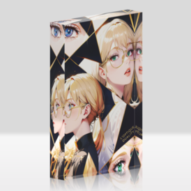 その眼差しに、もっとも近く。 - アクリルブロックTypeB『その眼差しに、もっとも近く。』 ありのままの素肌と、彩りを纏った表情。100×148mmのクリアな空間に、対照的な二つの輝きが共鳴します。背面のクリア処理を透過する光が、頬に散りばめられた光彩の粒子と溶け合い、まるで純度の高い宝石を覗き込んでいるかのような奥行きを演出します。 厚みのあるアクリル越しに覗く視線は、平面を超えた「実存感」を作品に宿します。差し込む光によって刻一刻と表情を変える色彩は、まさにその場所で彼女たちが呼吸しているかのような臨場感を与えてくれるはずです。 ■ 飾らない純粋さと、飾り始めた意志 1枚目の「すっぴん」が放つ、何にも染まらない無垢な透明感。そして2枚目の「ナチュラルメイク」が呼び起こす、瞳の奥に宿る確かな意志。 「隠す」ための化粧ではなく、内側に眠る光を縁取り、呼吸させるための彩り。二つの表情が交差するシンメトリーな構図は、美しさの定義が一つではないことを静かに物語っています。 ■ 広告ビジュアルとしての完成 架空のコスメティックブランドのコンセプトポスターをイメージして構築された、洗練されたグラフィック。イラストと光、そしてアクリルの質感が三位一体となり、日常を彩る至高のインテリアとして一つの「完成」へと至りました。 その眼差しが持つ静かな熱量を、ぜひお手元でご堪能ください。 ■ 商品仕様 ・サイズ:100 x 148 (mm) ・背面処理:クリア ・素材:透明アクリル ・片面印刷