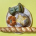 6センチほどの長いフランスパンとカンパーニュ、よもぎリボンパン、カボチャパンの4点セット+おまけの和柄トレイです。 推しの撮影小物として、小さなご家族やお友達への贈り物として、ミニチュア好きな方にお迎えいただけたら嬉しいです。 [作品について] 主 材:樹脂粘土、紙 サイズ:1㎝〜6㎝ 特記事項:小さいパーツが取れてしまった時はボンドで接着可能です。