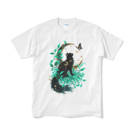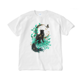 Tシャツ(短納期) - XL - ホワイト「セレスティアルナイト」Tシャツで魔法の世界へ踏み出そう。この高コントラストのイラストには、鮮やかなエメラルドティールの葉の中にたたずむ威厳ある黒猫が描かれ、金の三日月を見上げています。繊細な金のチェーンや星、幻想的な蝶がこの夢のようなシーンを完成させ、天体美学や自然、猫の神秘的な魅力を愛する人にとって完璧な主張アイテムとなっています。