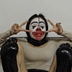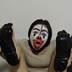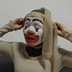 A beautiful lady put on a McDonald's clown makeup, then do some funny face and dance. Then she put the stockings on her head, and finally painted her neck black, and also painted the soles of her feet black and show with her funny face.