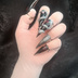 ☆新作☆【妖ノ爪~蛇−カガチ−(銀×黒)】 素材:レジン、ネイルポリッシュ、硬化性合成樹脂、ポリウレタン、塩ビ、金属、スワロフスキー リングサイズ:フリーサイズ(調節可能) 個数:1セット(両手指:10個) 付け外しが楽でリング調整可能なネイル付きリングです。 デザインは蛇と彼岸花をあしらったシンメトリーです。 頭部のみの蛇以外はネイルの裏へも身体を巻き付かせております。瞳はスワロスキーを使用。 写真5、6枚目は装着イメージです。 ネイル自体はやや大きめに作っておりますが、個人の手のサイズにより大きく見えたり、小さく見えたり個人差が御座います。 ※ゴミのように見える白い粒は〝ラメ〟です。 ※注意事項※ ・一つ一つハンドメイドです。個体差が御座いますがご了承願います。 ・ネイルリングは調節が可能です。ご自身の指に合わせて行ってください。ペンチを使うとサイズ調節しやすいです。 ※調節する際はゆっくりおこなってください。 ・爪先が尖っておりますので、人の多い場所で使用する際は周りへのご配慮をお願い申し上げます。 ・誤飲を防ぐため、小さいお子様やペットの手の届かない所へ保管してください。 ・購入後の返品、交換はおこっておりません。 ・購入後の転売は固くお断りいたします。 ・お問い合わせがある場合はお手数ですがメッセージよりご連絡ください。宜しくお願い申し上げます。
