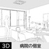 【クリップスタジオ用に制作した3D素材】 病院の個室です。 床面積は10.8平方メートル、天井高は2.5メートルの病院の個室です。 備品として床頭台やサイドテーブル、点滴台や松葉杖、スタッキングチェアやソファと洗面台などを置いています。 ベッドは背を起こしたものとフラットなものとあるのでシーンに合わせて表示を切り替えてお使いください。