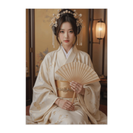 ポスター - B2この商品はpixivFACTORYで作られた商品です。サンプル画像は完成イメージのため、実物と異なる場合があります。 柔らかな白と金を基調にした、上品で静かな雛姫ポートレート。 繊細な刺繍と控えめな輝きが、和の美しさを際立たせます。 落ち着いた空間に調和する、気品ある和風アート作品です。