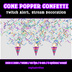 Animated confetti cannon stream alert for streamers and VTubers — WEBM with transparent background and sound, 3 layout options. Three confetti cannon alerts in one pack. A 3D cone popper appears, spins, shoots a burst of colorful confetti and disappears. Option 01: single cannon. Option 02: mirrored pair. Option 03: triple volley across the bottom. Bring celebration to your stream with these bright booms!