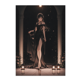 ポスター - B2この商品はpixivFACTORYで作られた商品です。サンプル画像は完成イメージのため、実物と異なる場合があります。 静かな夜の庭園で、黒いイブニングドレスをまとった女性が優雅に歩み出る瞬間を描いたポスター作品です。 柔らかなランタンの灯りと花びらが舞う幻想的な空間が、上品で落ち着いた雰囲気を演出します。 クラシックなアーチの建築と黒ドレスのコントラストが印象的な、エレガントなアートポスターです。
