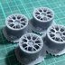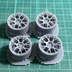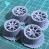 RE-V7自作ホイール。1/24スケールで19インチになるようにサイズを設定しており、1台分の4本のホイールの商品になります。 ※ホイールのみの購入ではタイヤは付属しません。タイヤ付セットが単品よりお得になっております。 ホイールサイズ(19インチ) 外径 約22mm 横幅 約11mm PCD114.3 光造形式8K 3Dプリンターで印刷し、積層ピッチは0.2mmです。2次硬化、洗浄は実施済み。 現品は無塗装、形成色はグレーになります。当製品はレジン製で加工にスキルが必要です。中級者以上推奨。 材質はレジンですのでプラモデル用接着剤では接着できません。3Dプリンタで印刷する関係上、積層痕が発生しています。やすりで表面を磨くか、サーフェイサーを吹いたうえで塗装すると積層痕が軽減されます。 サポート材を切り離す際はニッパーなどで一つずつ切り出してください。無理な力がかかると本体にダメージが入る場合があります。 形成色がマーブル状になる場合がございますが、レジン樹脂の色素の沈殿によるもので、そのままお使いいただけます。 A/T社、H/F社それぞれに適応するように別形状のナットパーツが付属します。 ホイールの種類によってブレーキハブとの距離が異なるため、最適なナットパーツを使用して、お好みの位置を調整してください。 使用するホイールの種類によっては加工が必要な場合がございます。サイズが合わない場合は紙やすりで削る又は、マスキングテープを巻くなど加工してお使いください。