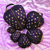 ゴシックアンドロリータをイメージして作りました。 紫地と黒いレースを合わせてシックで退廃的ながらも、いちごの粒粒を金糸で施すことできらびやかさをプラスしています。 ゴロッとした苺をそのまま立体にしたようなポーチは少し毒を含んでいて存在感たっぷりです。 ゴスロリ+いちご好きさんへプレゼントしても喜ばれるいちごグッズです。 紫のツイル生地にレースを重ね、イチゴのつぶつぶをミシン刺繍で均一に施してあります。 黒い生地でストロベリーの葉っぱらしいカーブが形作られています。 裏地が付いていてボリューム感のあるコロンとした形状で、 内布は紫色のチェック地に小さないちご模様で全体的に紫&いちごで統一しました。持ち手にはゴールドの飾りブレードが縫い込んであり華やかです。 金色のつぶつぶを刺繍する時に、紫の表地とキルト芯を重ねて一体化させています。キルト芯をはさみ込むことによって、立体がしぼむ事が和らぎ、より安定して形状をキープさせました。 ハロウィンに LL~SSSサイズまでマトリョーシカのように1段階順に次の大きさのポーチへ収納可能です。 LL:直径約21cm,高さ約21cm L:直径約17cm,高さ約17cm M:直径約14cm,高さ約14cm S:直径約12cm、高さ約12cm SS:直径約9cm、高さ約10cm SSS:直径約6cm,高さ約7cm