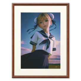 原画のデジタルアートを最適な構図でA4サイズにトリミングし、画材紙へ印刷したオリジナル作品です。 ブラウンカラーの額縁に収めています。