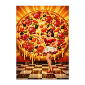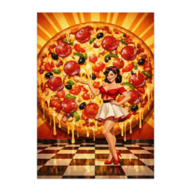 巨大ピザとピンナップガール|とろけるチーズのポップアートポスター