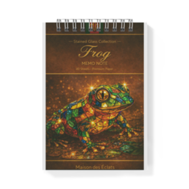 メモ帳 - A6 - 片面光を閉じ込めた、一匹のカエル。 色の断片が重なり合い、静かに輝くステンドグラス質感。 見る角度によって表情を変え、だだのメモ帳に、少しの特別を与えます。 日常に記録やアイデアを書き溜めるだびに、手元に小さなアートが残る感覚。 使うほどに、感性に寄り添う一冊です。