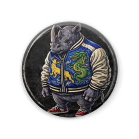 缶バッジ - 57mmスカジャンをまとった、無骨でクールなサイ。 重厚さとストリート感が同居する一体。 缶バッジで登場。