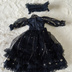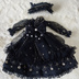 ご覧頂きありがとうございます! ・・・漆黒の闇にゴールドの糸で描かれたのは、古き良き時代の物語。 チュールレースが重なり合うティアードスカートは、まるで月夜に揺れる幻影。 胸元で輝くパールと大きなリボンが、あなたの大切なドールを真夜中へと誘います。 <セット内容:2点> ドレス、ヘッドドレス <対象ドール> Model:MDD(L胸、もち足) 対応サイズ:1/4ドール(MDD(S胸、L胸、もち足対応) 以下注意点になります。 ご理解、ご了承頂いた上、ご注文お願いします。 ・セット内容に記載なき商品(ドール本体、ヘッド、ウィッグ、靴など)は含まれておりません。 ・素人作品のため、裁縫が甘い部分や多少のシワがある場合が御座います。 ・サイズ確認のため、MDDに試着を実施しており、完全な新品ではございません。 ・お客様のご都合による返品は受け付けておりません。