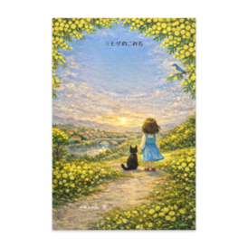 ポストカード(10枚セット) - ヴァンヌーボVGスノーホワイト195kg絵本「ミモザのこみち」オリジナルグッズ 「ミモザのこみち」 仲町かれんデビュー作 ~緑道物語 シリーズ第1作~ 表紙を飾った登場人物ミモザ、黒ねこ、女の子。夕日に照らされた二人が、ミモザの丘で幸せなひとときを過ごす美しい場面が、ポストカードに収められています。 <10枚セット>