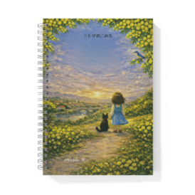リングノート - A5 - 片面絵本「ミモザのこみち」 仲町かれん デビュー作 ~緑道物語シリーズ 第1作~ 表紙絵 黒ねこと女の子が、夕日に照らされたミモザの丘で幸せなひとときを過ごす美しい場面です。 Amazonkindleで出版 Amazon ミモザのこみちで検索 kindle版 紙版ともに発売中!!