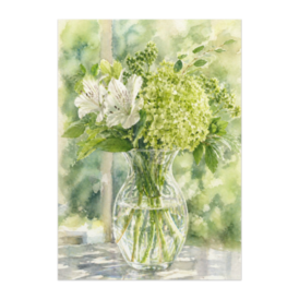 緑に包まれる花束 ― 自然光とガラスの水彩アート