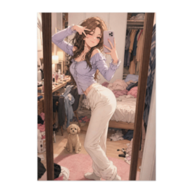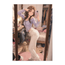 ポスター - B2この商品はpixivFACTORYで作られた商品です。サンプル画像は完成イメージのため、実物と異なる場合があります。 誰にも見られていないと思っているその瞬間。 鏡の前でキメる彼女の姿を、 ただ一匹の小さな犬だけがじっと見つめている。 言葉はない。 リアクションもない。 ただ静かに「見ている」存在。 日常の中にある、ささやかなズレとユーモアを感じられる作品です。