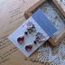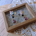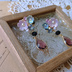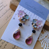 6㎜のスワロフスキーをメインに、アクリルフラワー、小粒スワロフスキー、アクリルビーズを貼り付けピアス本体に重ね、ガラスビーズ、アクリルカットのチャームを繋げました。