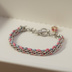 マクロスΔより マキナ・中島をイメージしてブレスレットを製作しました。 チャームはピオ二ーピンクのストーンとリボンのジュエリークリップで表現。 ★素材について ・色紐→ロー引き紐 ロー引き紐は色によって硬さが異なります。(この商品は柔らかめのロー引き紐を使用しています) ・金属パーツ(チェーン、マンテル、丸カン等)→ロジウムメッキ(※1)加工品 (※1)[ロジウムメッキ]とは 耐食性、耐磨耗性に優れていて変色しにくく金属アレルギーを起こしづらい特徴があります。 しかし、真鍮や銅にメッキを施しているため磨耗により下地が出てアレルギー反応が出ることがあります。 金属アレルギーをお持ちの方はご購入の際に確認してください。 ☆サイズについて ・工房匠ではデザインと着けやすさを重視しているため、お客様に合わせて長さを調整致します。 お気軽にご相談ください。 (手首の太さ+0.5~1㎝が目安です。 女性の方は+1~1.5㎝がオススメです。) ◎製品について ・一品一品丁寧に製作しておりますが個体差やミリ単位でのサイズ誤差、歪み等が発生する場合がございます。予めご了承ください。ハンドメイド作品に理解のある方のみご購入をお願いします。 ・お使いのパソコン又はスマートフォンのモニターやディスプレイによっては商品の写真と実物の色が違って見える場合がございます。 イメージ違いなど、お客様のご都合による返品・返金はお受けできませんのでご了承ください。 ※トラブル防止のため、気になる点がございましたらご購入の前にお気軽にお問い合わせください。