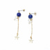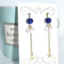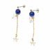 惑星と流星をイメージしたピアスです。 惑星は品質の良いA級のラピスラズリ、流星はメタルパーツです。夏らしいピアスに仕上げました。 ロングピアスタイプで、動くたびに星が揺れ可愛いですよ♪ ・全長:ピアス金具含め6.4cm ・ラピスラズリは直径8mm ・ペア売り *** ラピスラズリとは・・・ 「幸運を招く石」といわれ、邪気を退け、正しい判断力を高め、最高の幸運を呼び寄せてくれるとされています。 写真では分かりづらいですが、吸い込まれそうな深いブルーの中に細かいパイライト(黄鉄鉱)が入っており、チラチラと金色に光ります。またパイライトが入っていると金運が上がると言われています。 ※天然石は色や模様の入り方には個体差があります。また個体を選ぶことはできません。