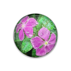 雨に濡れるニチニチソウのピンバッチ