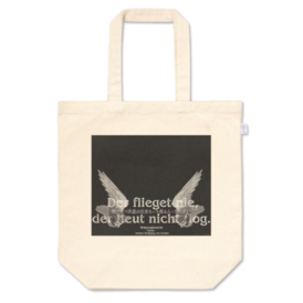トートバッグ - M - プリント面積中ゲーテの『ファウスト』第24章ヴァルプルギスの夜より、飛ぶのを躊躇う年若い魔女に向かって古参魔女が掛けた台詞(森鴎外先生訳では「きょう飛ばないなら、飛ぶ日はないぞよ」)と、ベルリンの戦勝記念塔・ジーゲスゾイレの女神像の翼。白黒反転した黒バージョンです。 この商品はpixivFACTORYで作られた商品です。サンプル画像は完成イメージのため、実物と異なる場合があります。