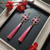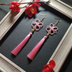 ご覧頂きありがとうございます(^_^) アジアンコード(1mm)で作った吉祥結びとタッセルを組み合わせたピアスです。結びとタッセルの間に取り付けたキラキラとしたゴールドの透かしビーズがアクセントとなっております。 着物、浴衣、袴、和ゴス、和ロリ、チャイナドレス等の衣装にあわせていかがでしょうか?(^_^) 飾り部分 約10.5cm(結び約3~3.5cm四方) 金具の変更は ★金属イヤリング(ネジバネ式 ★樹脂イヤリング ★樹脂フック ★ポストピアス に無料変更可能です。ご希望の方はメッセージくださいませm(_ _)m ※こちらは結び部分の後ろ側を乾くと透明になる接着剤で固めてあります。またハンドメイド作品になりますので、ひとつひとつ差異があります。市販のもののような完璧さや耐久性をお求めの方はご購入をお控えください。 飾り結び 中国結び メドゥプ アジアンノット タッセル チャイナ 中華風 和風 鬼滅 鬼滅の刃 刀剣乱舞 とうらぶ 和ゴス 和ロリ 和 着物 袴 浴衣
