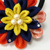 浴衣や小紋など、ちょっとした和装に便利なヘアゴムです。 もちろん洋服にも合います。 オレンジ部分は柄のある布を使用しているので、同じ布で作っても同じものはできません。ある意味一点ものです。 同じデザインで色違い・柄違いもありますので、ぜひご覧ください。 ※ヘアゴムの土台を変更しました ■素材 布=一越ちりめん、パーツ=金属(色:シルバー)、パール、スワロフスキー、ヘアゴム(色:ブラック) ■大きさ つまみ細工=直径4cm、ヘアゴム=直径5cm ☆こちらの作品は、柄のある布を使用して製作されています。 2つ目以降は全く同じものを作ることができません。予めご了承ください。 再販毎に写真を撮影して掲載しますので、その都度ご確認ください。 《作品NO.151》 ラッピングサイズ S