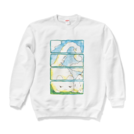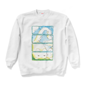 スウェット - XL - 雲この商品はpixivFACTORYで作られた商品です。サンプル画像は完成イメージのため、実物と異なる場合があります。 ---------------------------------------- 雲かと思ったら、ふわふわした謎の生き物だった...という四コマをスウェットにしました。