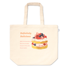 トートバッグ - L - プリント面積中キラキラのデコレーションケーキをデザインしたトートバッグです。 文面は「キラキラ星のデコレーションケーキ。女の子は甘いものみんな大好き。甘いものを食べてみんなキラキラ輝くの。」と言う意味です。 みんなキラキラしよう! サイズは大で480mm×400mm× マチ150mmです。 この商品はpixivFACTORYで作られた商品です。サンプル画像は完成イメージのため、実物と異なる場合があります。