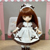 オビツ11サイズのスイーツ柄のワンピースセットです。 クラシカルな雰囲気になる様製作しました。 ピコニーモPボディでも着用できます。 ★セット内容★ ・フリルカチューシャ(ワイヤー入り) ・ワンピース(後ろ半開きスナップ仕様) ・エプロン(後ろ全開スナップ仕様) 以上3点のセットです。 柄の出方は写真と異なる場合があります。ご理解いただける方のご購入をお願いします。 家庭用ミシンと手縫いを併用して仕上げています。 端処理は主にピケ、一部ロックミシンを使用しています。 身頃部分のみ白色の裏地付きです。色移りが気になる方は長期間の着せ付けはお控え下さい。 着せる際はハンドパーツを外していただくとスムーズに着せられます。 その他注意点はSHOPご利用案内に記載していますのでご一読下さいます様お願い申し上げます。 よろしくお願いします。