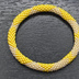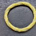 クロッシェは、その名の通り編むことです。 ビーズクロッシェは、糸にビーズを通してから編みます。 きちんと模様が出るようにビーズを通すのは、 機械ではできないので手作業です。気が遠くなるような作業です。 そんなこんなで、 一回り丸小ビーズ6個でブレスレットにしました。 細めですので、2本3本と重ね付けするのもお洒落です。 ゴムブレスレットとは違うので、装着にコツが必要です。 親指を手のひら側に折り曲げ手を細めて、 手のひらの上を転がすようにします。 親指の根本の関節が固く、 手をすぼめるのが不自由な方は装着ができません。 御自身の手と相談して、御購入を検討下さい。 ●大きさ● 黄×白・紺×黄:内円周15~16cm 緑×黄・黄×クリーム:内円周16cm 廃番色等、製造中止になったビーズも遠慮使ってしまいました。 同じには作れませんので、各1点限りとなります。 気になる方はお早目の御購入を検討願います。