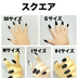1/4、1/3ドール用ネイルチップ。 ネイルチップの形がお選び頂けます。 黒いネイルチップが形の参考写真です。 デフォルトはアーモンド型になりますので、それ以外をご希望の方はメッセージにて番号と形をご連絡下さい。 例(NO-1スクエア、No-2ロングアーモンド) セット内容 ドール用ネイルチップ12枚セット 10本+予備チップ2枚 シール付き(小さく切ってお使い下さい) サイズS MSD、SDM、MDD、DD普段のサイズ着用参考サイズ。 サイズM SD DDデカハンド装着参考サイズ サイズL SDGR、SD16 装着参考サイズ サイズ B-L サイズ 男の子SD13、SDGR-B男の子ハンド装着参考サイズ