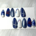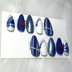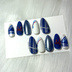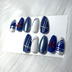 【商品説明】 刀剣乱舞 堀川国広をモチーフに普段使いも可能なデザインを制作しました。 刀剣乱舞ミュージカル参騎出陣を記念として作らせて頂きました。 親指:ジャケットの縦ライン装飾をイメージしたホワイトラインを使用し堀川国広の目の色をイメージした模様を入れております。 人差し指: 三騎出陣三振り共有のデザインとして更に同じ土方歳三の刀である和泉守兼定と同じ配色となっております。 和泉守兼定→紅色 堀川国広→青色 2振りの目の色→水色をイメージしたカラーが入っています。 中指:極をイメージし全体に白色のミラーパウダーを使い目の色をイメージした模様を入れております。 薬指:和泉守兼定と同じデザインの結び目をイメージしたリボンをジャケットの色をベースマット調の上に乗せております。 小指:和泉守兼定と同じデザインをしており 堀川国広の青と極のマフラーをイメージした白で模様を描いております。 その他気になる点などございましたら、ご検討段階でもお気軽にご相談ください。 【販売内容】 モチーフネイル10枚×1セット 【サイズ・ネイルチップタイプ変更について】 ・サイズ変更とネイルチップタイプ変更は無償です。画像のサイズ一覧表から「形・各指の番号」お選びいただき、メッセージでサイズをご指定ください。 【サイズの測りかた】 爪のカーブにあわせて定規ではなくメジャーで爪の端から端までを測ってください。 メジャー等が難しい場合テープ等でカーブ端に印をつけてそれを定規で測って頂くとう工夫をお願い致します。 心配な場合はひとつ大きめのサイズがおすすめです。 お届け後にファイルで端を削ることで調整も可能です。 【注意事項】 ・ひとつひとつ手作りで作成しておりますので、ご理解いただける方のみご購入をお願いいたします。