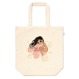 トートバッグ - M - プリント面積中このトートバッグは、「ありのままの自分が愛される価値がある」ということを思い出させてくれます。花を抱きしめる女の子は、自己受容や癒し、やさしい強さを象徴しています。自分にも、まわりの人にも、やさしさを持って使ってください。