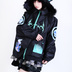 ジルパンク × 台湾タトゥーアーティスト《美味製造》デザイン 🔥 サイバーフレイムでエネルギー補給 🔥 防風素材+中綿キルティング裏地でしっかりあったか フードにはコントラストカラーのファー付き(フード部分はジッパーで着脱可能) クマ耳付きフードの内側には個性的な総柄生地を使用 全体に《美味製造》先生描き下ろしのサイバーデザインプリントを多数配置