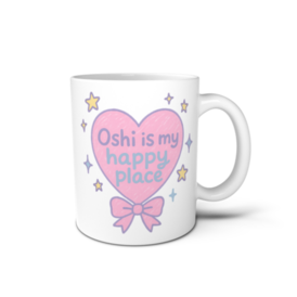 「Oshi is my happy place」マグカップができました🎀 ゆめかわなハート&リボンデザインで、毎日のティータイムも推し色に🫖💕 推しを想いながらほっとひと息…☁️