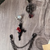 終夜の帳に響く、薔薇と十字の静かな物語 終夜ノ薔薇奇譚カフ 黒いクロスに紅い薔薇を絡め、チェーンと歯車でミステリアスな世界観を表現した片耳用イヤーカフ。 存在感のあるチャームとクラシカルな色彩が、耳元に深紅の夜を咲かせます。 チェーン部分は着脱可能で、シーンやお好みに応じて印象を変えることも可能です。 フック側の石は乳白色にほんのり青みを宿したビーズで、光の角度により幻想的な表情に変わります。 アンティーク×ゴシックを楽しみたい方、ダークロマンな装いのワンポイントに。 【スチームパンク イヤーカフ 薔薇 チェーン ゴシック 黒 赤 十字架】 ご使用にあたってのご注意 ・固定部分は接着剤とレジンで丁寧に加工しております。強度は高いですが、強い衝撃を与えると破損する場合がございますので、やさしくお取り扱いください。 ・金属パーツを使用しております。金属アレルギーをお持ちの方は、ご使用をお控えいただくか、十分にご注意ください。 ・イヤーカフやイヤーフックは、長時間着けても痛くなりにくい仕様ですが、着け心地には個人差がございます。 気になる点やご不安な点がございましたら、ご購入前にお気軽にお問い合わせください。