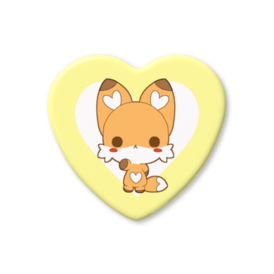 ハート缶バッジ - 57 × 52.5mmラブデリフレンズの仲間、きつねのハート缶バッジです。 商売下手だけど、いつか木の葉で作ったアクセサリーを売って生計を立てたいと思っている、頑張り屋な男の子。