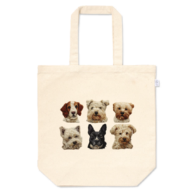 トートバッグ - M - プリント面積中6匹の個性豊かな犬を刺繍調の繊細なタッチで表現したトートバッグです。 ■ 仕様 素材:綿100%(12オンス) カラー:ナチュラル 本体:360 × 370 × マチ110mm/容量10L 持ち手:25 × 560mm プリント:透明転写方式(CMYK) ※透明転写方式により、デザイン周囲にわずかな透明縁が生まれます。これが刺繍パッチのような立体感を演出し、手仕事の温かみを表現しています。白色は生地本来の色で表現され、落ち着いた自然な色調に仕上がります。 ■ 製造について 一点一点丁寧に製作するため、印刷位置(±5mm)、マチ(最大±6mm)、持ち手長さ(最大±25mm)、縫製部分に個体差が生じる場合があります。天然素材特有の風合いの違いや異原糸の混入も、一点ものとしての個性としてお楽しみください。 ■ ケア 裏返して洗濯ネット使用を推奨。アイロンは当て布の上から、プリント部への直接高温は避けてください。