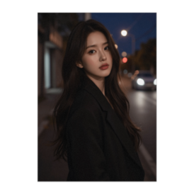 この商品はpixivFACTORYで作られた商品です。サンプル画像は完成イメージのため、実物と異なる場合があります。 夜の街を背景に、黒いコートを纏った女性を描いたポスター作品。車のライトや街灯に照らされ、静かでドラマティックな雰囲気を放っています。