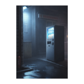 この商品はpixivFACTORYで作られた商品です。サンプル画像は完成イメージのため、実物と異なる場合があります。 深夜の街角でひときわ光を放つ自販機。静けさと光の対比が印象的なアートポスターです。雨上がりの路面に映る光が、どこか懐かしくも美しい情景を描きます。