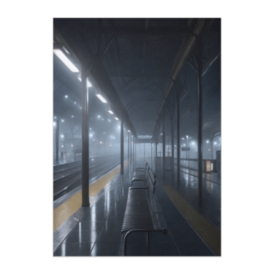 この商品はpixivFACTORYで作られた商品です。サンプル画像は完成イメージのため、実物と異なる場合があります。 霧に包まれた夜の駅ホーム。静まり返った空間に光がぼんやりと滲み、時間が止まったような感覚を与えます。旅情を感じる幻想的な一枚。