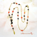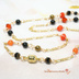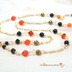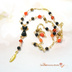 深い夜を歩く黒猫のように、静かな気配を纏うショートネックレスです。 シンプルな装いにも映える、オレンジ×ブラックのバイカラー。 漆黒のオニキスにキャッツアイガラスが微光を放ち、オレンジのスワロフスキーが秋の灯りのように煌めきます。 羽根のチャームがそっと揺れて、黒猫のしっぽのような愛らしさをプラス♪ さりげなくハロウィン気分を楽しめるデザインです。 ワイヤーを巻くメガネ留めという技法で繋いでいるため、外れて壊れる心配なく長くお使いいただけます。 ネックレスの留め具は着脱簡単!ネイルが気になる方にもおすすめのマグネット式です。 ★オニキス★ ・成功の象徴とも呼ばれている石。 ・根気と集中力を養い、意志力を強化するサポート。 ・自分の中の悪い感情や惰性に打ち克つ助けになると言われる。 ・夫婦の幸せを保つ効果もあるとされる。 ・人に影響されやすい人や、物事が中途半端になりがちな人にお勧め。 【主な使用ビーズ】 天然石 オニキス スワロフスキー インディアンレッド キャッツアイガラス オレンジ チェコラウンド ブロンズ チェコWフェイス ジェット 金具カラー:ゴールド 【サイズ】 ペンダントトップ 約5.5cm ネック部分 約46cm ※金属アレルギー、メッキ加工が肌に合わない方はご注意ください。