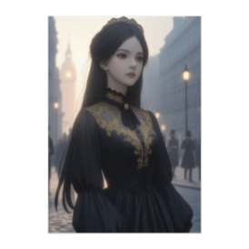 この商品はpixivFACTORYで作られた商品です。サンプル画像は完成イメージのため、実物と異なる場合があります。 黎明の光が差し込むロンドンの街。 黒のドレスを纏う女性の穏やかな表情に、時代を超えた静けさを感じる。 柔らかな逆光と繊細な刺繍が、幻想的な美を演出します。