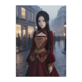 この商品はpixivFACTORYで作られた商品です。サンプル画像は完成イメージのため、実物と異なる場合があります。 深紅のドレスを纏い、霧のロンドンに佇む女性。 金の刺繍が温かく光り、冷たい空気の中に情熱を宿す。 クラシックロマンの香り漂う一枚です。