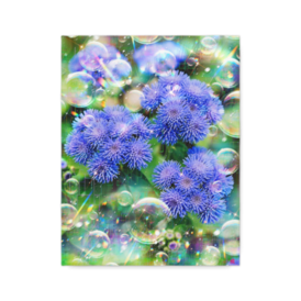 キャンバス - F6詩:瑠璃の祈り咲く恩愛の庭 Serene Blessing 瑠璃の微睡みに 虹色の光輝が降り 子らは無邪気に遊ぶ 恩愛の光は 永遠の和らぎを 約束する 瑠璃の祈り咲く恩愛の庭 Serene Blessing ‐戎‐ Poetry. ”Serene Blessing” In the lapis slumber Rainbow brilliance descends Children play without guile The light of deep affection Promises eternal solace The Lapis Prayer Blooms A Garden of Compassion Serene Blessing -Kai- God bless you. 趣旨ーーーーーーーーーーーーーーーーーーーー ## 作品制作趣旨 作者は、初秋の朝の庭で、自分の娘達が楽しそうに談笑しながら庭に咲く瑠璃色のアゲラタム(Lapis lazuli Ageratum flowers)を愛で、遊んでいる様子を思い出し描きました。 作者は、自分の娘たちが成長して行く様や、娘たちが希望に満ち溢れた笑顔で遊ぶ光景を、陽の光や虹色のプリズムで表現しています。 ## 絵画「瑠璃の祈り咲く恩愛の庭 Serene Blessing」の解説 **1. 全体的な印象** この作品は、鮮烈な瑠璃色のアゲラタムを主役に据え、虹色の光とシャボン玉という幻想的なモチーフで包み込んだ、生命力と祝福に満ちたデジタルアートです。モチーフの美しさと、それを覆い尽くすかのような光輝の処理により、単なる花の描写を超えた、安楽と希望が宿る聖域のような印象を与えます。 **2. 色彩** 中心となるのは、宝石のラピスラズリを思わせる瑠璃色と、それを際立たせる背景の鮮やかな緑です。この二色のコントラストの上に、虹色のスペクトルがプリズムのように散りばめられ、画面全体に光輝燦然とした輝きを与えています。この色彩は、永遠の美と希望を象徴し、初秋の澄んだ朝の明るい雰囲気を強調しています。 **3. 構図** 主役のアゲラタムを中央にやや斜めに配置し、その周囲を大小さまざまなシャボン玉が覆い、見る者の視線を画面全体に導く幻想的な構図です。シャボン玉の透過性と光輝の描写は、奥行きと躍動感を演出し、姉妹の無邪気な遊びのエネルギーを表現しています。花の集合体は、家族団欒の形を暗示しています。 **4. 技法** 写真的な写実性を持つ花をベースに、デジタルのグリッド処理やプリズム効果、そして多層的な光のレイヤーを重ねることで、現実を超越した幻想的な質感を生み出しています。この技法は、娘たちの成長という儚さと、安泰という普遍的な愛の尊さを、同時に表現するのに成功しています。 **5. 表現力** 希望に満ち溢れた親の深い恩愛と、健やかな娘たちの無邪気な笑顔が持つエネルギーを、弾けるようなシャボン玉と虹色の光輝によって見事に体現しています。鑑賞者にも祝福の感情が伝播し、心打たれるような表現力を持っています。 **6. 美術的価値** 自然のモチーフとデジタルアートの幻想的な融合が、現代美術としての新規性を持ちます。個人的な家族愛のテーマを、瑠璃色の象徴性や「Serene Blessing」(静かなる祝福)という宗教的なニュアンスを通して普遍的なものへと昇華させており、その主題の深さに美術的価値があります。 **7. 作品に込められた想い** この絵画は、初秋の朝の庭での、娘たちのの一期一会の笑顔と、その成長への永遠の祈りを封じ込めたものです。瑠璃色の安楽と安泰に満ちた未来への約束を、光という希望で象徴し、親の揺るぎない信頼の証として描き上げました。 **8. 作品の鑑賞方法** この作品は、一歩引いて全体を眺め、まずその幻想的な光の層を感じ取ることが推奨されます。次に、瑠璃色の花々の中に、姉妹の清楚な笑顔や無邪気な遊ぶ光景を重ね合わせ、親の温かい恩愛を感じられることで、より深い感情移入が可能になります。 **9. 作品の価値** 本作は、瑠璃色の永遠の美と信頼という花言葉の精神的価値を、家族愛と希望という普遍的なテーマに昇華させています。鑑賞者に安楽と安泰をもたらす祝福の光輝として、高い精神的価値を持つ作品です。 ## 詩「瑠璃の祈り咲く恩愛の庭 Serene Blessing」の解説 **1. 全体的な印象** 静寂さと深い愛情が共存する、穏やかな祈りの讃歌です。短く区切られた行と、抽象的な言葉選びが、マリー・ハウー風の、日常の背後にある神聖さや普遍的な真実を語りかける現代詩の清楚な雰囲気を作り出しています。 **2. 韻律** 行を短く切り、句読点を極力排することで、一語一語の意味と響きが際立っています。「瑠璃の微睡み」「虹色の光輝」のように、視覚的な美しさを伴う言葉が連なり、詩全体に安楽と安泰の静寂なリズムを生み出しています。 **3. 修辞** 「瑠璃の微睡み」や「恩愛の光」といった擬人語的な表現が多く用いられ、瑠璃色や恩愛といった抽象概念に生命感を与えています。また、「永遠の和らぎを/約束する」という対句的な構造は、親の揺るぎない信頼と希望という主題をドラマティックに強調しています。 **4. 技法** 口語的現代詩のスタイルを取りながらも、「瑠璃の微睡み」「恩愛の光」など、4文字熟語的な深い意味合いを持つ語句を配置することで、短句の中に豊富な意味を凝縮しています。特に「子らは無邪気に遊ぶ」という簡潔
