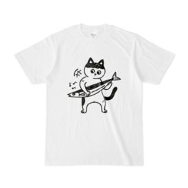 Tシャツ - XL - 白秋刀魚をゲットしたづらねこ君、 嬉しくてギターごっこ!